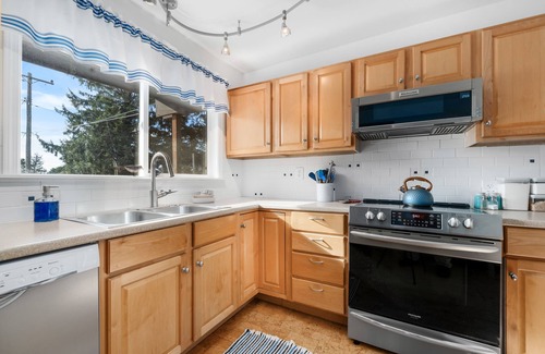 Enjoy streaming movies & shows from our comfy sectional or play one of the many provided board games. With over 1,500 square feet of space on two floors, there is room to spread out and relax. Wifi too! A reading corner in the living room is a nice place to relax or nap too. Access to the balcony from the upstairs offers chairs for a distant view of Yaquina Lighthouse and fun people watching in the summer.