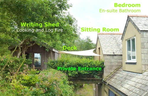 Private Entrance to a Suite of 4 rooms; including Superking Bedroom with Ensuite Bathroom, separate Sitting Room and The Writing Shed with bespoke Kitchen. Also Private raised Deck and an attached private woodland Barbeque area.