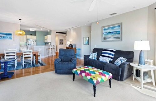 Step inside after a full day of adventures and you'll be utterly charmed by the smart décor and furnishings of Sweet Summertime. Light pops of blue perfectly complement the warm neutral palette in the sunny living area, dining area, and kitchen, creating a light and airy space that's perfect for family get-togethers. Relax on the cozy furniture as you catch up on your favorite TV show in the spacious living area that features access two a covered deck on each side of the condo unit. Beautiful floors expand from the dining area with seating for 6 to the fully stocked gourmet kitchen with plenty of prep space, and seating for 2 at the bar.