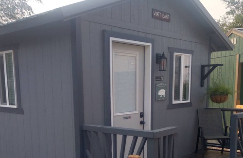 This cabin has it's own bathroom. self check in, free WIFI, fully stocked fridge, and pantry in the coffee shop, smoking is allowed outside, fire pit, Cornhole, we have the animal sanctuary nearby, Thunder mountain Indian Monument is right across the freeway. and Rye Patch Dam is close by also.