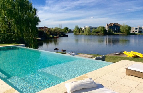 Casa con costa a la laguna y muelle. Amplia galeria y parrilla. Pileta con borde infinito, solado humedo y jacuzzi. Cerco de pileta opcional. Jardín agradablemente amueblado con living de exterior a 2 mts de la laguna. Muelle con trampolín y 2 kayacs. Cómoda orientación NE.