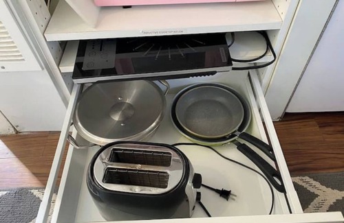 You will be in LOVE with the original double pink sink and the pink stove (stove for looks only, use inductive electric cooktop).