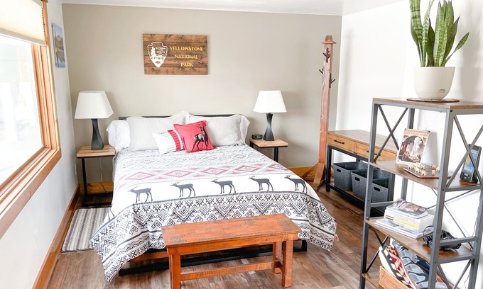 Our walk-out studio apartment comes equipped with all the comforts of home including a pillow-top, queen bed, full bathroom with tub and hand-held shower head and a full kitchen. The sofa with extended chaise is the perfect spot to relax, catch a movie or check your email after a full-day exploring Yellowstone! The full kitchen will allow you to fix your own meals and pack lunches in the available cooler for your journey into the Park. Smart TV and Wireless Internet are included.
