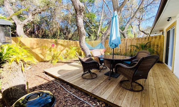 Backyard: tall fence, charcoal grill, hammock, table with chairs.