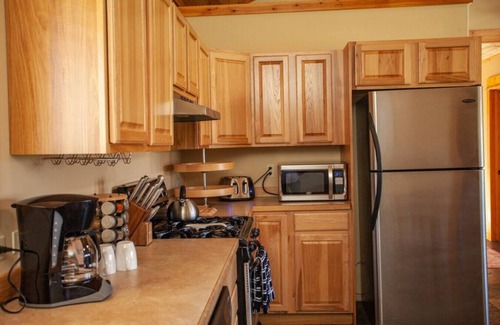 The kitchen is STOCKED with all the dishes, serving ware, small appliances like blenders, crockpots, regular 12-pot coffee maker, toaster, sharp knives and more. You will want for nothing and never want to leave the simple, fun, clean and convenient Yellowstone Crest Lodge!