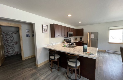 As mentioned above, each unit has two bedrooms and one bathroom. It also has a laundry room, washer and dryer, with laundry soap and dryer sheets provided (nice for those guests who have been traveling for a bit!). There is a queen bed in each bedroom, and there is a queen size sleeper sofa in the living room. We provide extra blankets, pillows, and sheet sets for the sleeper sofa. The bathroom has a tub/shower combo, as well as hairdryer and towels provided. We have a full kitchen with a full size oven, fridge, microwave, and dishwasher. All of the basic kitchen essentials are provided along with dish soap. You cannot carry bear spray on the airplane, which is why we provide it for you! It is located above the microwave in the kitchen. Parking in Gardiner can be a struggle - not here! There is one parking spot per unit provided, right in front of the building. There is also a paved handicapped spot right in front of our ADA unit for those in need of it.