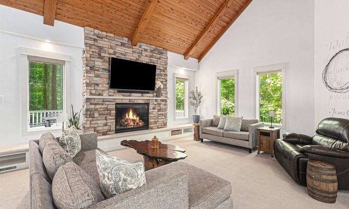 Start your day with coffee and conversation on the breezy screened porch or step out onto the deck to soak in the natural surround. The private hot tub, open year-round, is a peaceful spot to unwind after a day exploring. As evening falls, gather around the built-in fire pit with Adirondack chairs for s’mores and storytelling under the stars.