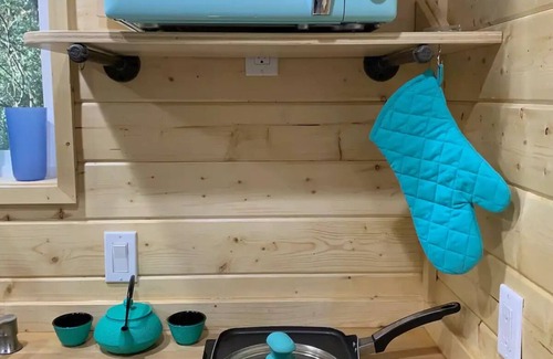 Three trees grow right through the deck and can be seen from all the inside windows. The deck is huge, with its own dining table. The solitude and views are wonderful. The kitchen is designed with all "retro" appliances. The fireplace lights up the dining room table and heats the space. All the walls are pine, and the indoor shower and full bathroom is made of artistic tile. The stairs are a brilliant space-saving design. Easier than any ladder or stairs I've ever seen in most tiny homes. Upstairs is a super comfy queen bed, a large "Hammock," and a couch/work space that turns into a double bed. You can watch movies suspended in the air on the hammock, looking down at the dining area. It's so comfy you might even prefer it to the high-tech mattress. There are three skylights looking straight up at the massive trees and three upstairs windows. There's air conditioning and wildlife, from owls and eagles to rabbits, coyotes, chipmunks, and deer. And you won't believe you are a ten-minute drive to all Portland has to offer, from the rose garden, council crest, hiking, and amazing food in trendy northwest like bamboo sushi, salt and straw, and voodoo donuts.