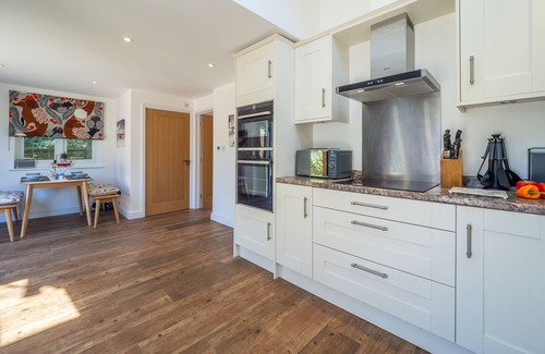 Inside, the house is stylishly decorated and furnished with luxurious extras such as underfloor heating, and crisp, quality ben linens. The well-equipped kitchen is spacious with both a small seating area for coffee, and a dining area with french doors leading out to the garden. The sitting room is a charming blend of modern and cosy, with a contemporary wood burning stove and modern art, complemented by comfy seating. Upstairs, choose between a double bedroom or a twin room with two single beds. The family bathroom is also on the first floor.