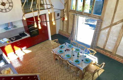 This double height striking room is a wonderful place to socialise with friends and family, with the perfect balance of traditional and contemporary. The fully equipped kitchen is the first thing that will draw your eye when you enter into the open plan living space - the ceilings are vaulted and the room is double aspect with large windows casting natural light into this amazing space. In the kitchen there is a tall fridge/freezer, an induction hob with an extractor, twin oven, a dishwasher, microwave and Nespresso machine. Beneath the mezzanine is a cosy sitting area with three comfy sofas, a Smart TV with Freeview, a DVD/CD player, an upright piano and a Bluetooth speaker to connect your own devices.