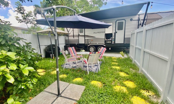 This memorable place is anything but ordinary. This a Glamping needs. You're going to enjoy a different kind of Stay! This is a cozy 1bedroom/1bathroom RV with a private entrance and parking for 2 cars. Perfect for a small family, couples, or solo travelers. You're also going to enjoy a private outdoor dining space/BBQ area fully equiped. We are located within 3.6 miles of the Desing District of Miami, and Midtown; 20 minutes to South Beach; 12 minutes from MIA International Airport.