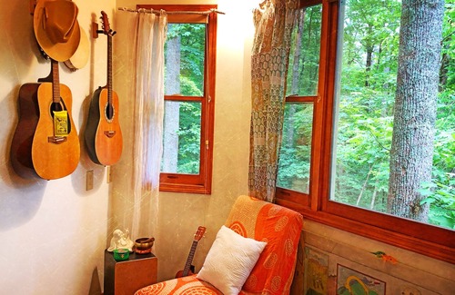 Relax, cook, play games, watch movies, snuggle in & read a great book, or just get quiet. A fully equipped home w/ a Treehouse feel. Enter into a Tranquil zone, surrounded by 9 forested acres. Relax, breathe, & just be :). Large covered L-shaped porch. Colorful Bohemian influences throughout.