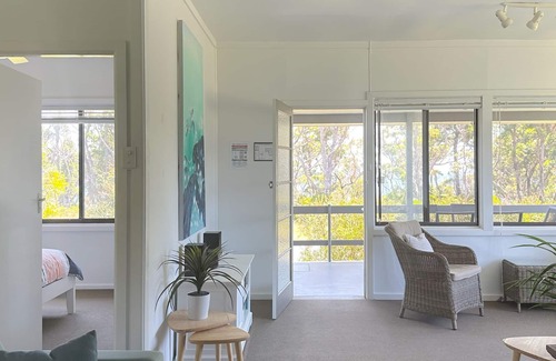 Relax on the undercover front deck and enjoy the ocean glimpses through the trees in the opposite waterfront reserve of washerwomans beach.