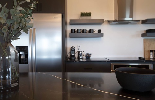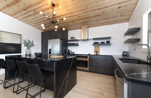 The kitchen is the showpiece of the home. Enjoy a thick quartz waterfall island and custom cabinets stocked with cookware, utensils, spices, and oils. Multiple choices of coffee are available for the Nespresso machine, provided for your stay.