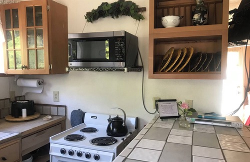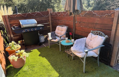 Located on Lewis Creek at 3000' elevation offers cool summers and mild winters. Listen to the sound of the water from the year-around creek running through the rear of the property or enjoy sipping your evening wine watching the tranquil water flowing downstream. The quiet neighborhood has a private park just 1/2 block away with a waterfall and swimming hole great for children, either 2 or 4-legged, where they can safely experience nature. The accommodations are perfect for two. There is a large bathroom with a claw foot tub, a fully equipped kitchen, and a private patio with a BBQ. There are several restaurants in Oakhurst as well as dining at Bass Lake. You'll have complete access to Lewis Creek to enjoy during your leisure time. The house below is also a BnB. The two houses are completely separate from one another sharing nothing except the entrance to the driveway.