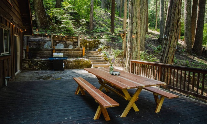 Mystic Pines Cabin is located in the quaint, historic community of Sugar Pine, once a thriving Logging town from 1889-1931. Wind your way along the Lewis Creek and enjoy the beautiful dogwood blossoms, wild sweet peas and many ferns surrounding the cabin. Drop a line in the creek for trout, hike the Lewis Creek Trail, or enjoy a relaxing afternoon on the expansive deck.