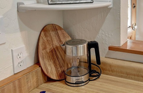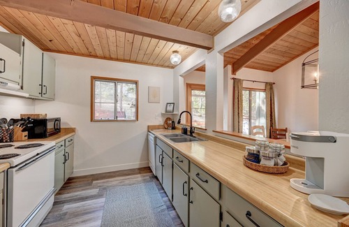 The kitchen is stocked and ready to prepare meals and includes an electric stove, oven, microwave, and dishwasher. A keurig and instant kettle are available with coffee and tea starter packs*. A variety of pots, pans and cooking utensils, as well as flatware, placemats, dishes, drinking glasses, and wine glasses stock the cupboards. Additional appliances include: blender, toaster, and 6 cup coffee maker.