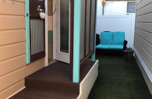 Kayadon 2 is a well-equipped 2 bedroom, 2 bath unique beach property utilizing an open concept design. Gliding barn doors separate the bedrooms from the living area providing privacy while maintaining an open feel. The front bedroom has a private bath that opens to an outdoor shower for rinsing off after a day at the beach or simply open the shower door to the outside and experience a shower under the stars! The back bedroom also has a bath entrance but is shared for common use. The living room and kitchen are a great room with an open concept. All furnishings are new with plenty of seating. Kayadon 2 sleeps 4 in beds. The couch is large enough to sleep a 5th person, however it would be cozy. The outside front porch is ideal for people watching and enjoying the weather. There is a side gathering area for relaxing. Parking in the driveway for 1 car and ample street parking.