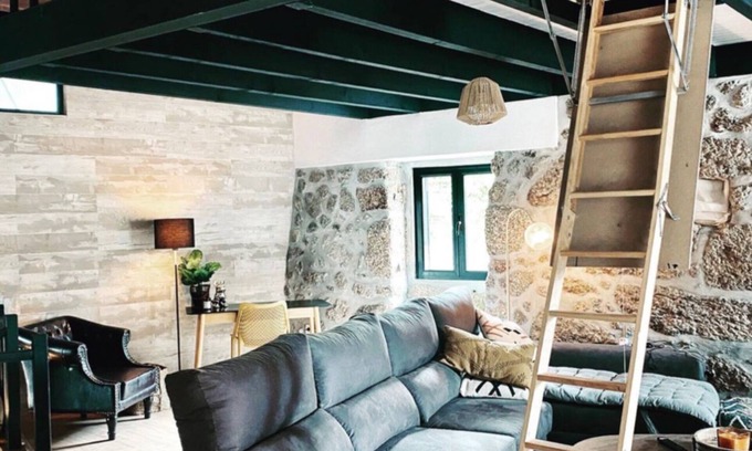 Step into the villa and feel at home instantly. The main floor features a spacious and accessible great room that comfortably sleeps up to four guests, perfect for groups of all sizes. The living area boasts stylish furniture, rustic stone walls, and an inviting loft, creating a warm and unique atmosphere for your stay.