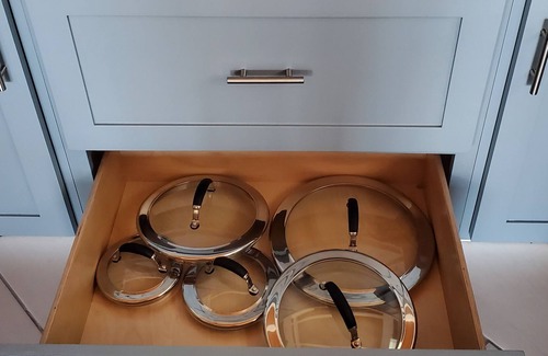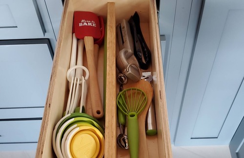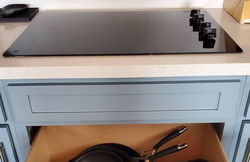 The newly remodeled kitchen has a contemporary beach vibe with open oiled Mahagony upper shelving, quartz countertops, custom lower cabinets with soft close drawers, and ceramic tile floor. NEW stainless appliances: Whirlpool 17.7cf refrigerator/freezer, GE ceramic glass top electric cooktop, Broan stainless range hood/fan, Large Panasonic convection / microwave / air fryer, Kohler single deep stainless kitchen sink, garbage disposal, GE macerating 3-tier dishwasher, cool water dispenser, Keurig K-Cup combo with 12 cup drip, French press, coffee grinder, and electric kettle. Circulon nonstick cookware/lids, Henkle knife set, Oster blender, Cuisinart four slot toaster, rice cooker, hand mixer, cookie sheets, loaf pans, BBQ utensils, colander, cooking/baking/entertainment utensils, silverware, serving bowls/dishes, and Pyrex bake/cookware.