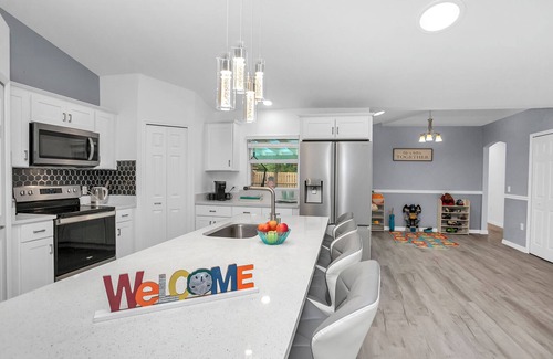 Welcome to our stunning vacation rental! This remodeled home boasts four beautiful bedrooms, each designed for every age group—pink, gold, navy. The master bedroom features a modern bathtub and shower. Relax in the living room with a leather couch, three electric recliners, and TV. Enjoy outdoor grilling. Kids have their play area, and the super spacious kitchen and dining area cater to family needs. Just 20 minutes from the beach! Heated pool. Perfect for a luxurious, family-friendly getaway!