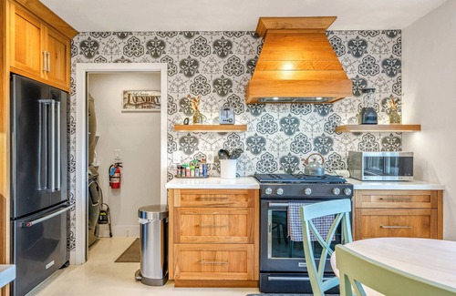 Stepping inside, you’ll be delighted to find elegant furnishings accented by stylish, high-end finishes. A statement gas fireplace is the highlight of the living room, surrounded by plush sofa and armchair seating and creating the ideal ambiance for a cozy movie night during the cooler months. All your favorite shows and movies can be streamed on the large, mounted smart TV. Whip up delicious, home cooked meals in the fully equipped, modern kitchen, complete with chef-inspired appliances and a full suite of cookware and dining ware. Dine together at the cozy table for 4 or enjoy a quick bite at the kitchen counter with high-top seating for 2. The front porch is the perfect spot for your morning coffee, watching the peaceful neighborhood come to life as you plan out another perfect California day.