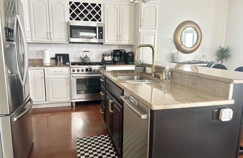 Lower level suite features a private bedroom with a Queen-size bed including a tv and DVD player, kitchen area, kitchen table, living area with tv, full-size sofa-sleeper, full bathroom and laundry room.