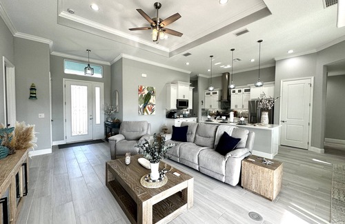 As you enter through the front door, you’re greeted by a bright and spacious living room featuring soaring tray ceilings and large pocket sliding glass doors that open to your own tropical oasis. The chic, modern furnishings in calming neutral tones create the perfect space to unwind—whether you're catching up on your favorite shows on the oversized flat-screen TV or curling up with a good book poolside.