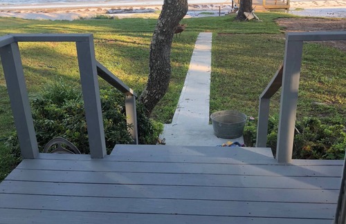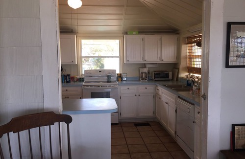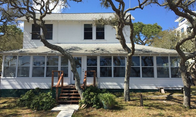 Waterfront vacation home built in 1930s, right on the Gulf. Well-chosen updates make it clean and modern, while retaining old-world charm: solid windows downstairs flood the house w light and provide views of passing dolphins and diving pelicans. The open kitchen lets you watch the kids playing on the sandbars while you're cooking. The outdoor shower under the oak trees with Gulf view? - doesn't get much better than that!