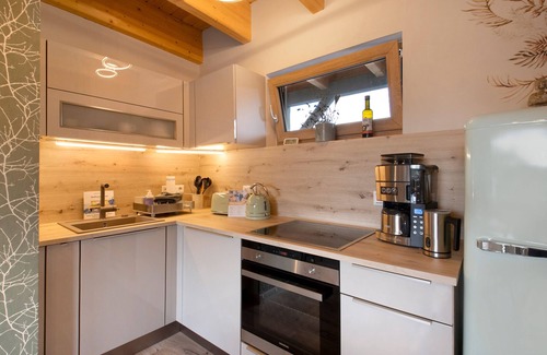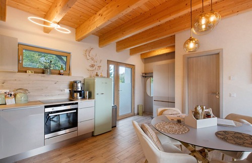 The stylishly furnished bedrooms offer retreat and privacy. The living area with integrated kitchen opens onto the covered veranda – perfect for outdoor breakfasts or relaxing evenings. A special highlight is the panoramic windows in the bedroom, allowing you to watch the stars from your bed on clear nights.