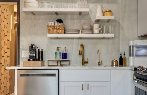 Chef’s kitchen with Vitamix blender, Opal nugget ice maker, stand mixer, and Nespresso coffee system