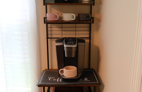 Cozy coffee bar stocked with a Keurig, drip machine, mugs, and all the essentials to start your morning right