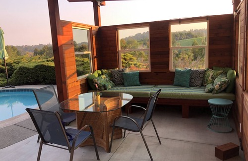 The Birdhouse at FancyNest Farm is perched among the pine trees on 2 1/2 acres, which seems larger because of sweeping western valley views of the vineyards, and overlooks a stunning pool. The light-filled, one bedroom home is perfect for your next relaxing vacation in the wine country.