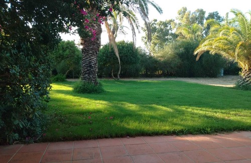 The house is in the 'Notteri' area towards Capo Carbonara, located in the strip of sand between the tourist port and the beach known as 'TIMI AMA', very close to 'Cala Giunco'. The adjacent salt lake is often frequented by pink flamingos that stroll very close to the entrance gate. The TIMI AMA beach, reachable in 5 minutes on foot, is five hundred meters away, it is mostly a free beach even if some umbrella services are available. Other beaches on the other front are within walking distance such as the small beach under the ancient tower. The house is laid out on the ground floor and is surrounded on three sides by a 1300 square meter garden planted with palm trees and pine trees. There are four bedrooms, two of which are doubles and two are doubles with bunk beds, each bedroom has a wardrobe, ceiling fan and air conditioner, two bathrooms (the second built in 2017) with sink, toilet, bidet and large shower, kitchen with all appliances (hob, electric oven, large fridge-freezer, washing machine, dishwasher). The large living room is equipped with a large extendable table and a ceiling fan and satellite TV. There is a large loggia with a second table for outdoor dining, a wicker sitting area, deck chairs and a beach bed. There are two outdoor showers. The outdoor wood-burning barbeque is no longer available in compliance with the ban on lighting fires outside.
