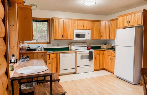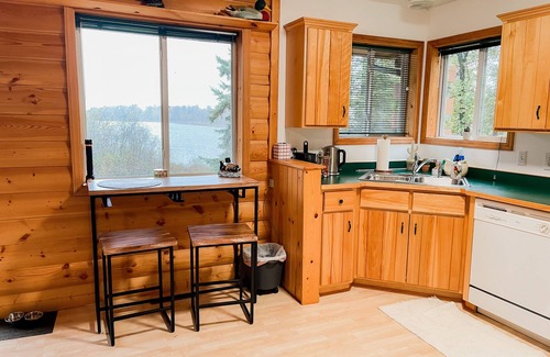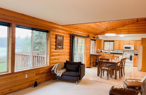 This lake home provides the perfect setting for a family or several couples to take in fun filled days, relaxing evenings by the campfire, watching the sunset on Mow Lake. The Log house has 4 bedrooms and 2 full bathrooms. Upon entering, you'll be greeted by the stunning natural log design that creates a cozy cabin atmosphere. On the main floor you will find 2 bedrooms with queen sized beds in each rooms and one full bathroom. Dining room and kitchen have everything you'll need to enjoy the incredible views of this one of a kind log home. Enjoy your morning coffee and breakfast at the spacious kitchen table while admiring the birches and pines that surround the property. In the basement you will find additional 2 bedrooms with queen sized beds, 2 additional queen sized futons to accommodate extra people and a full bathroom. The space also features a beautiful natural wood fireplace and a billiards table, perfect for spending quality time with family, kids, or friends.