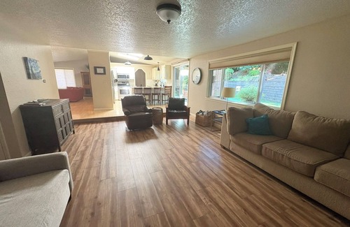 Enjoy a private, fenced back yard with large trees and a partially covered patio—perfect for unwinding after exploring local trails or Mt. Hood. Includes WiFi, AC, heating, and washer/dryer for your convenience.