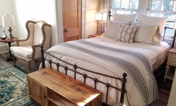 Relax in a serene, private, cottage setting nestled in Historic Montford. Surrounded by trees and charming homes, you'll love how close you are to downtown while feeling tucked away in your own cozy paradise. This newly renovated efficiency suite comes equipped with it's own entrance, private porch, dedicated parking, sitting area, kitchenette with breakfast bar, and bath.
