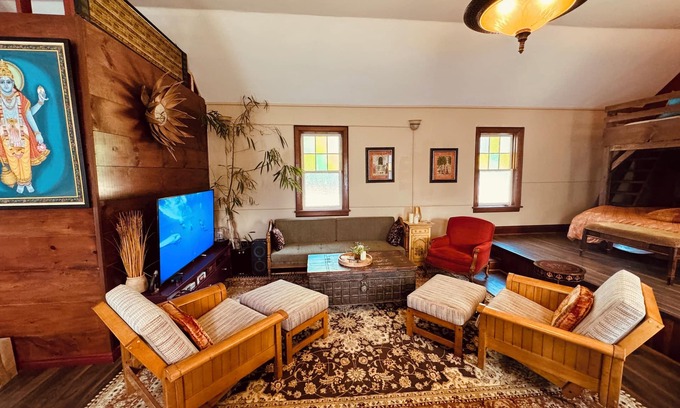 The property boasts an open concept living area with a large living room that comfortably seats eight, making it perfect for gatherings. The full kitchen and spacious dining area with an 8-person table allow you to share meals with loved ones. You’ll find multiple sleeping arrangements, including a luxurious king and queen bunk bed, traditional double beds, and a charming loft space. Additional amenities include 1.5 bathrooms and outdoor areas designed for relaxation, such as a private gazebo and a flagstone in-ground fire pit available for rent, providing intimate settings for pre-wedding celebrations or evening gatherings.