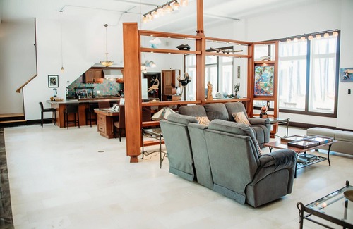 Sunset Dunes boasts a meticulously curated interior adorned with original sculptures, art, and artifacts. The kitchen is designed with Kosmos Granite throughout, features custom dining and cooking spaces illuminated by handcrafted Raku tile backsplashes and artglass lights.