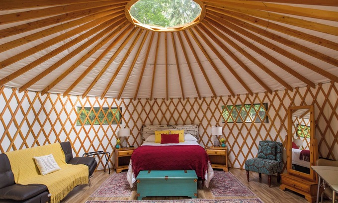 Get cozy and settle into this private backyard wooded setting. We have an outdoor kitchen with dishes, pots/pans, an air fryer, hot water pot, and pretty much whatever you might need to cook with except the food and consumables. We also have an emergency coffee kit with coffee, coffee mate, and a sweetener. A flushing toilet, outdoor shower, BBQ, and firepit. We are your base camp for the Mountain Loop hiking trails and have walking trails right out the back of the property. There is a river within a 3 minute walk and a lake within less than a 5 minute walk. Nature abounds, the birds will sing you through your stay. Our dog Lucy, loves to love! This is camping/glamping for sure. Grass and gravel. It's a jewel of a space and you won't want to leave! Very cozy and comfortable. The bathroom and yurt both have heaters. It's very wooded and fairly secluded/private. You will hear rural neighborhood sounds from time to time. We will continue to enhance this gem with you in mind.