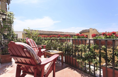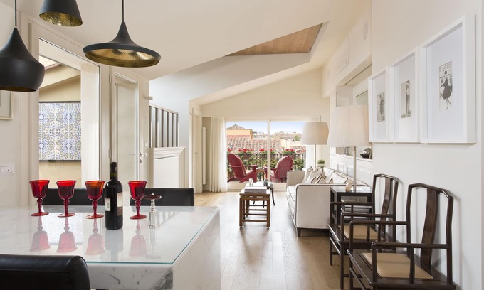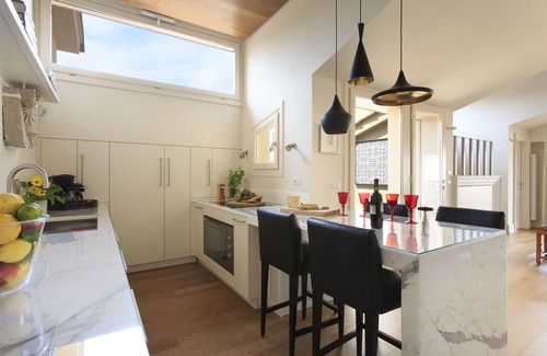 Situated right next to the buzzing Ponte Vecchio, this renovated 1100 sq ft / 101 sq m apartment on the top floor of a Renaissance building will charm you with its exclusive location. Luxurious furniture, Carrara marble and the omnipresent sunlight add to the beauty of this quiet and light apartment. Two exclusive terraces offer relaxation and spectacular views over Florence