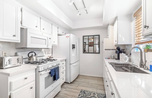 Step inside and relax with a glass of wine, take a dip in one of the two pools in the complex, or prepare a meal in the fully stocked kitchen, or fire up the electric grill on the private balcony. Prefer dining out? You’re just minutes from some of Palm Springs’ best restaurants. Grocery stores are also close by if you’d rather stay in.