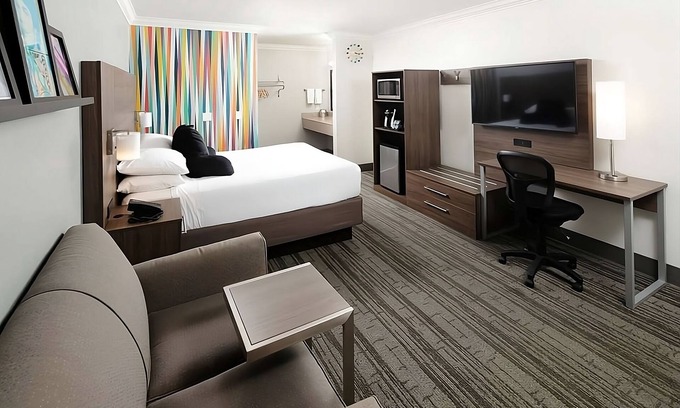Modern units and a pool on site. Near theater, restaurants & entertainment.