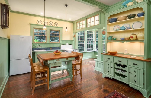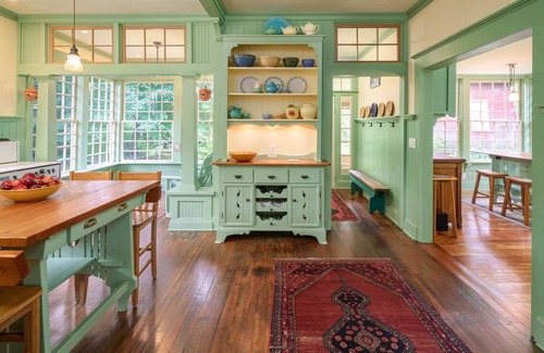 The first floor features a huge kitchen with banks of French pane windows looking out over the original farmstead and garden. A gas fireplace in the kitchen adds a warm ambiance to any evening. The kitchen also features two large service pantries with complimentary espresso, french press coffee, locally made bagels, orange juice, assorted wines, beer and other beverages. The dinning room features walls of enormous French pane widows looking onto the completely private gardens. The front rooms feature a large fireplace, comfortable seating and unique art. A large front porch, deep back porch and kitchen side sun porch round out the many ways to enjoy this amazing house.
