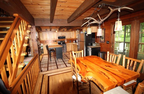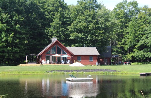 MINUTES FROM ELK MOUNTAIN SKI RESORT. 70 acre property with two exquisite homes. Private lake for your enjoyment! Large hot tub, Whirlpool tub, Game room, Flat screen TVs with Streaming & DVD, Wireless internet. LOTS to do outdoors - Ski at PA's best Elk Mountain, swim in the property’s natural spring fed lake, fish for bass in the lake and small pond (catch and release please) or fly-fish in the running creek, for keeps! Go hiking on the property’s beautiful land with its fresh running creek and discover hidden treasures (legend has it silver can be found in the creek bed!) as you make your way to the picturesque waterfall! Relax and enjoy the property’s full size hot tub, outdoor decks, canoe and row boat, paddle boat, paddle boards, rafts, outdoor fire pits, horseshoe pit, and in the winter enjoy cross-country skiing and the many sledding hills! Enjoy s’mores and watch shooting stars! When in season, you are welcome to pick fruit and vegetables from the organic garden and abundant fruit trees throughout the property. For indoor fun - rest and relax in front of the beautiful fieldstone fireplace and enjoy the Cathedral ceilings, cozy up in the loft and read one of the many books and magazines available to you, or watch a movie via streaming (Netflix/YouTube Stream) or DVDs for your browsing pleasure. If you choose you can also engage in a full suite of games on-site; Pool Table, Darts, Basketball, Foosball, Air Hockey, Xbox, ample board games and card games to suit everyone’s tastes! Main house has 3 bedrooms, full bath and full service kitchen and Carriage House has 1 bedroom, full bath and kitchenette plus a massage chair - perfect for families/friends travelling together but wanting their own personal space! Private 1/2 bath is located in the garage, ideal for use when enjoying the outdoor activities. Intercom installed for your chatting between houses.
