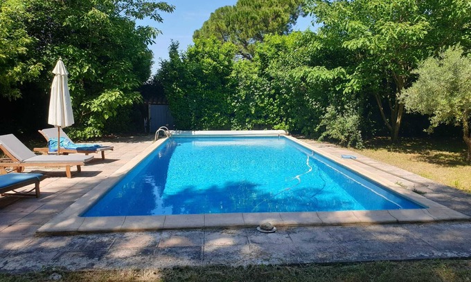 Historic stone townhouse in village centre with huge and stunning park-like "secret garden" behind, 15m pool and completely private walled terrace. 3 double bedrooms plus double-bed equipped mezzanine. 3 minutes from the Pont du Gard. Easy access to Uzès (15 min), Avignon (25 min), Nimes (25 min), Arles (30 min). The Camargue, Montpellier, Mediterranean beaches and numerous other Occitainie and Provençal attractions within an hour's drive.
