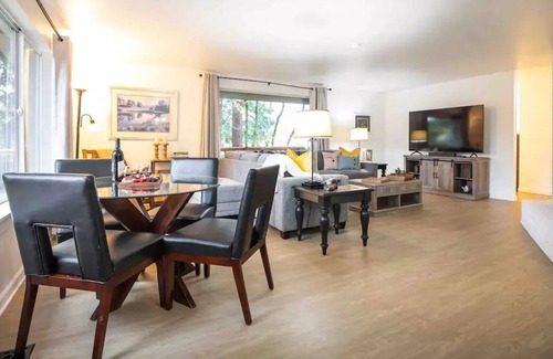 Living room area/reading corner: Large sectional couch with 72” flat screen (sign in with your personal login for Netflix, Hulu, Amazon Prime, Disney+, etc.), Bose sound bar, fireplace with firewood provided (additional firewood and starter can be purchased and delivered,) famous duck rocker chair with books available for your entertainment (more books located down stairs in the game room) and a cozy 4 person table overlooking the lake.