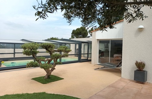"2019" important works from February to April, swimming pool redone and enlarged to 8 X 3 with beach for children, we install a swimming pool shelter 1m 90 high guaranteeing you an optimal use of the heated swimming pool, we also arrange and enlarge the terraces and pergola to enjoy outdoor life.