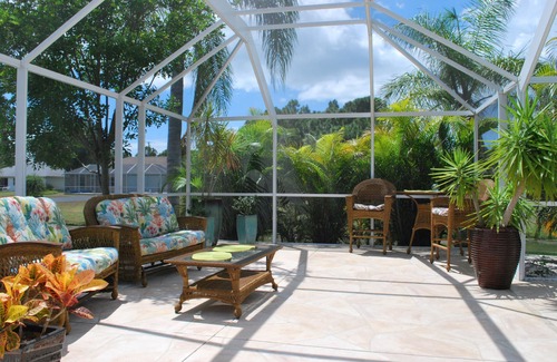 Separate from the outdoor dining area, a beautiful, all-wicker seating area is available for your pleasure of freshly brewed coffee (espresso machine on the premise), and freshly squeezed orange and grapefruit juice conveniently picked right off the trees in the backyard. A gas barbecue is also provided. It is the perfect tranquil spot to rest, enjoy the peaceful view of the pool, and most of all, observe an abundance of local wildlife (ibis, egrets, wood storks, cranes, herons, osprey, anhingas, cormorants, and gopher turtles).