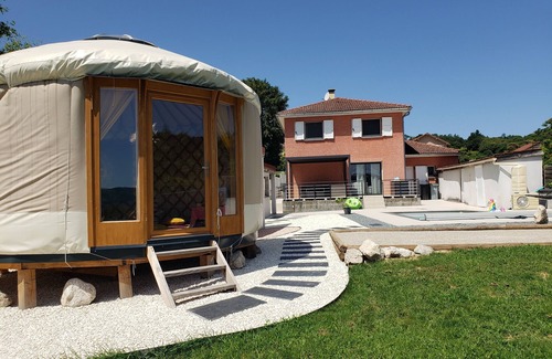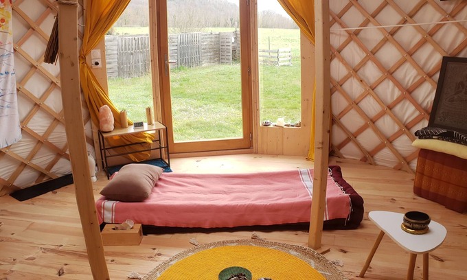 Yourte à 15 Minutes du lac de Paladru Vue sur les Montagnes, Dépaysement Assuré is located in Chabons. Yourte à 15 Minutes du lac de Paladru Vue sur les Montagnes, Dépaysement Assuré provides accommodation, featuring Pool, Designated Smoking Area, Bedding/Linens, among other amenities. This Cabin features Pool, Designated Smoking Area, Bedding/Linens, to make your stay a comfortable one.